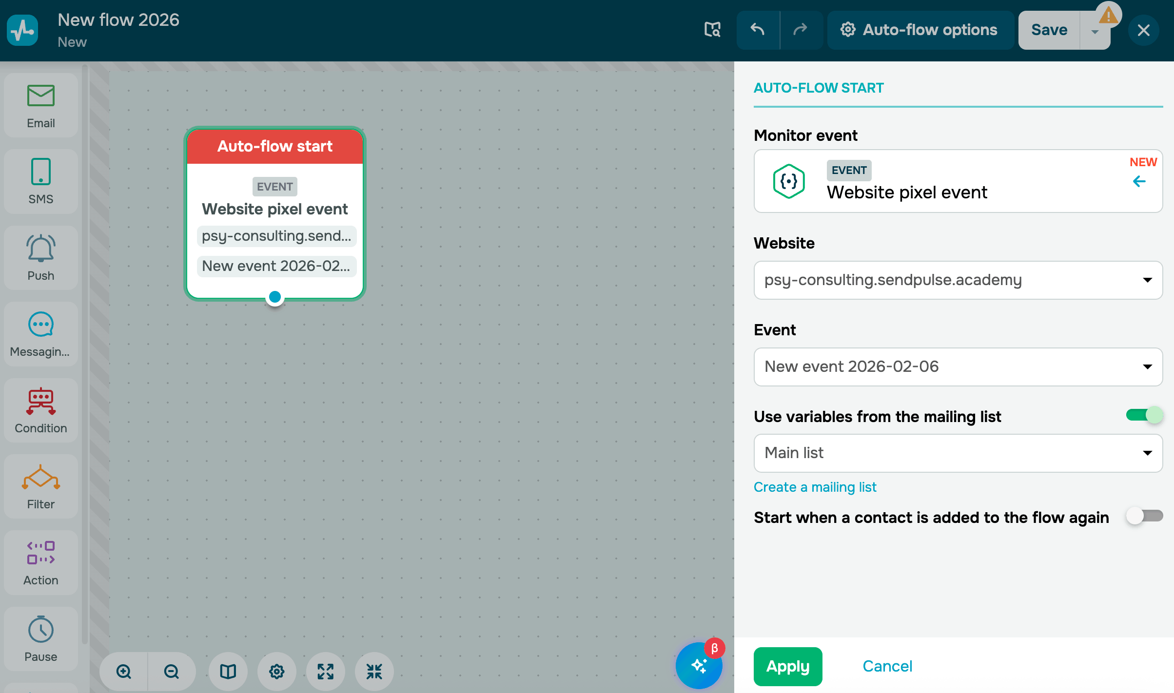 With SendPulse, you can build an automated flow that triggers when the SendPulse pixel detects events on your website. This helps you automatically respond to visitor actions and trigger interaction scenarios in real time.