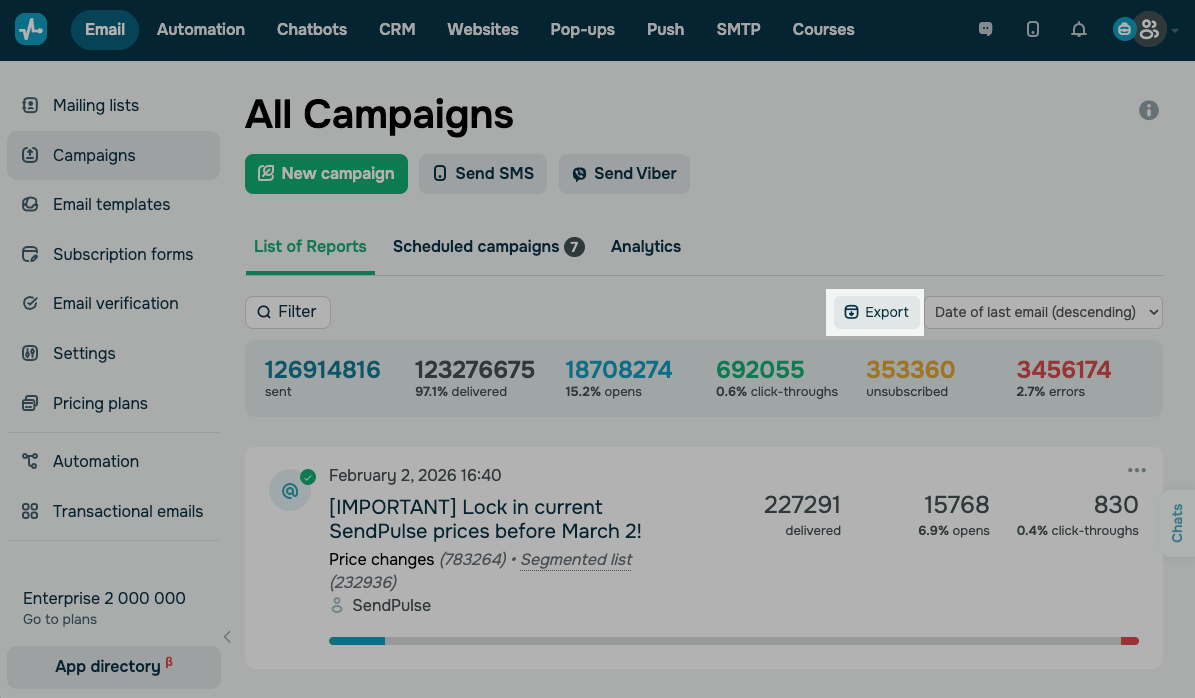 You can export campaign history to compare engagement and delivery trends across campaigns, or to build a report in Excel or Google Sheets.