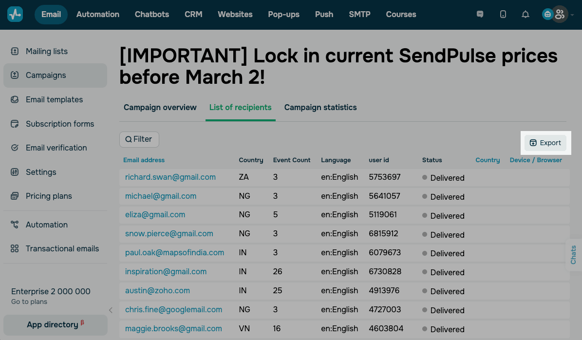 You can apply a filter to export recipients with a specific delivery status, such as Delivered, and see who received your email.