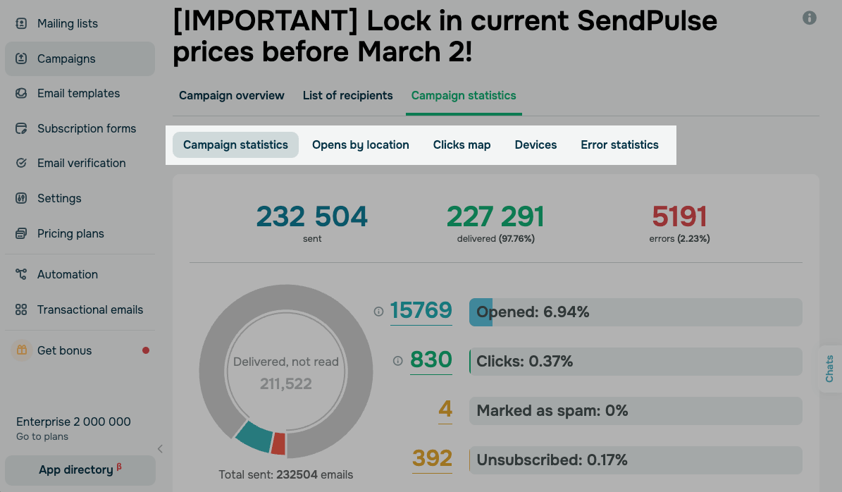 | Campaign statistics | The number of sent and delivered emails and errors. |