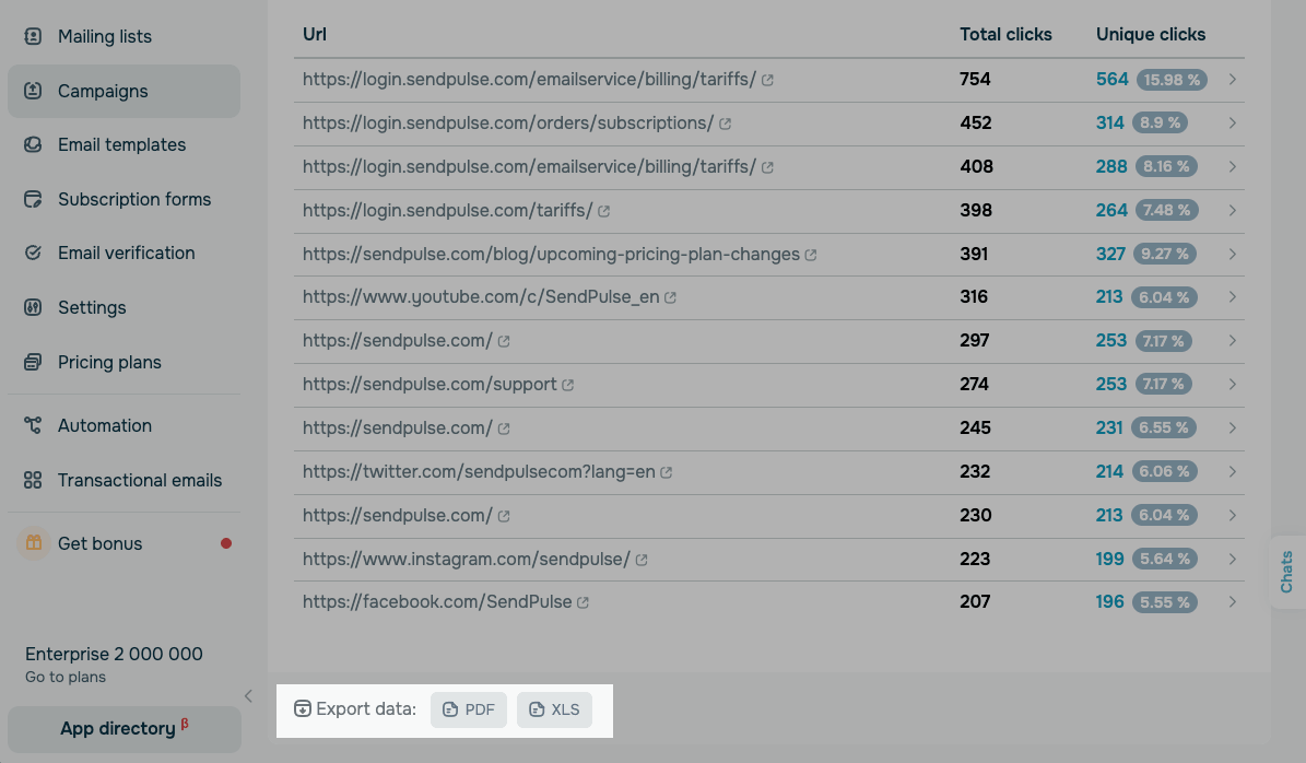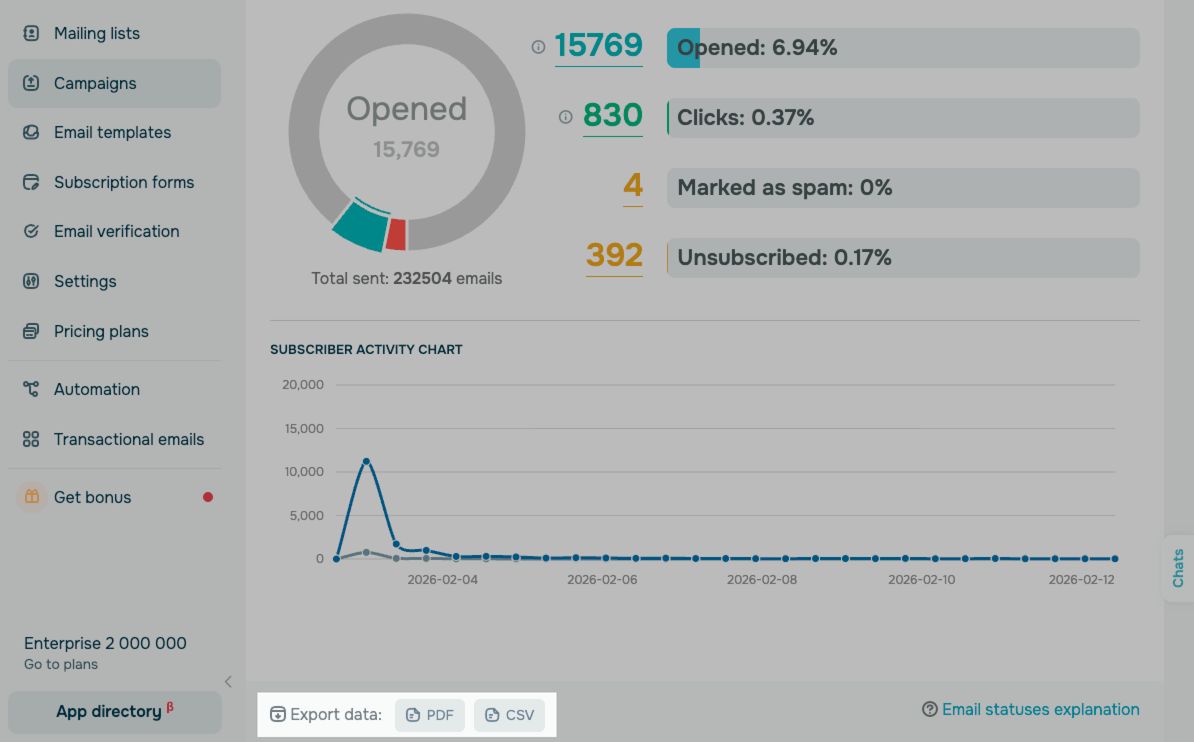 Go to the Campaign statistics tab. Scroll to Export data. Select a data format, such as PDF or CSV.