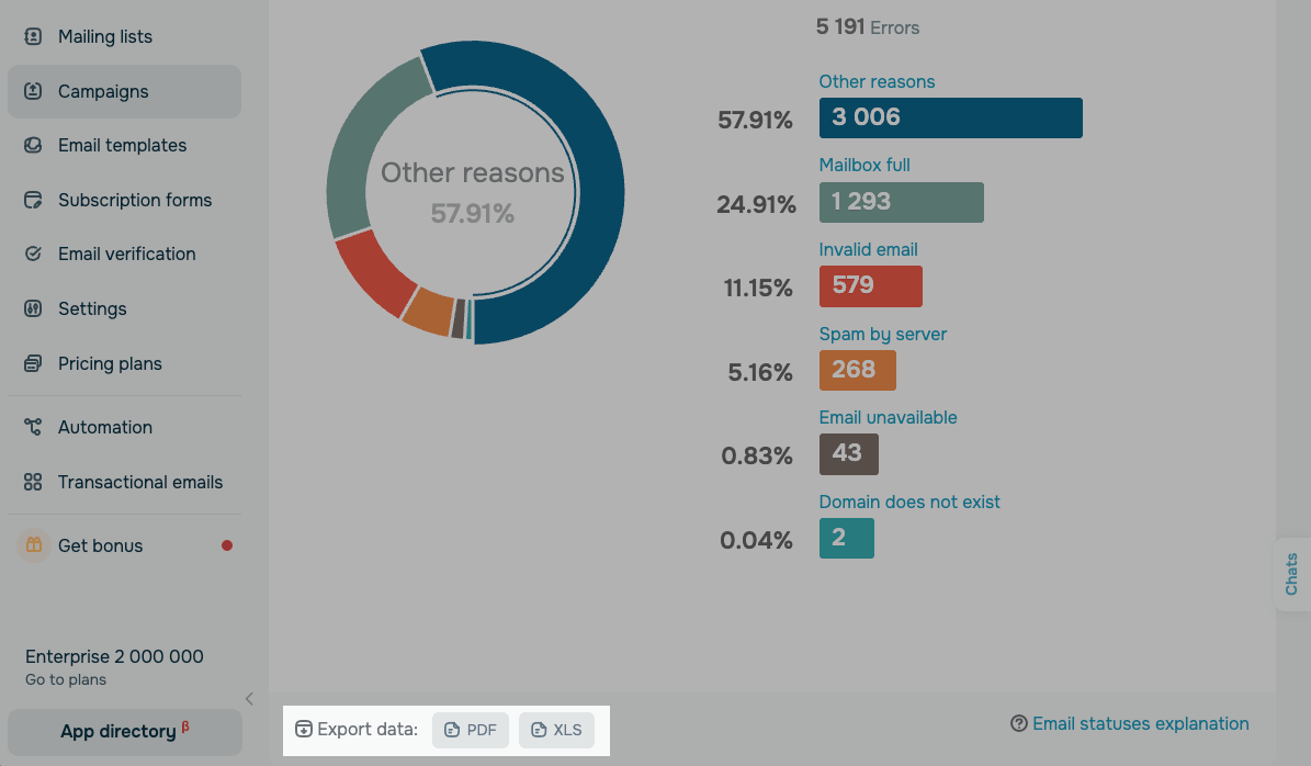 You can export error statistics to check for deliverability issues and compile a report for your team.