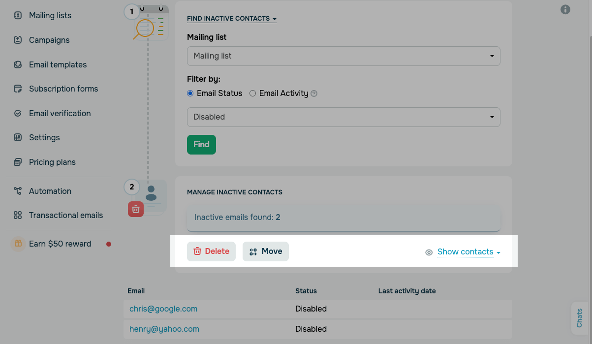 Also, you can view the list of contacts. To do so click Show contacts. There will be contacts with Email, Status, and Last activity date fields.