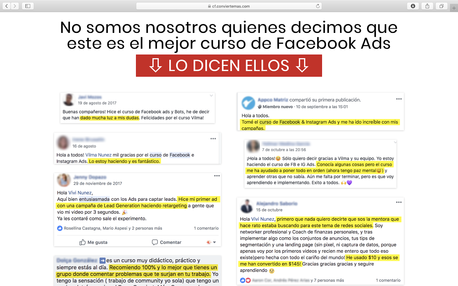 Testimonios en Cartas de Ventas de curso Facebook Ads de Vilma Núñez