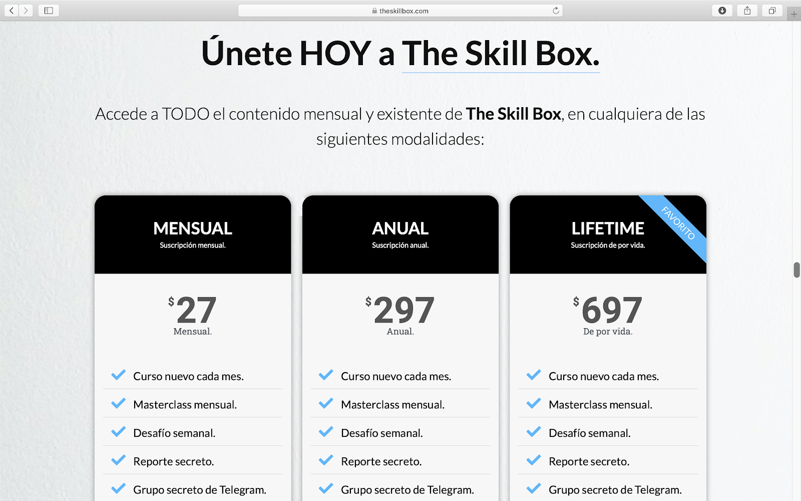 Sección de Precios en Carta de Ventas de The Skill Box de Cris Urzua.