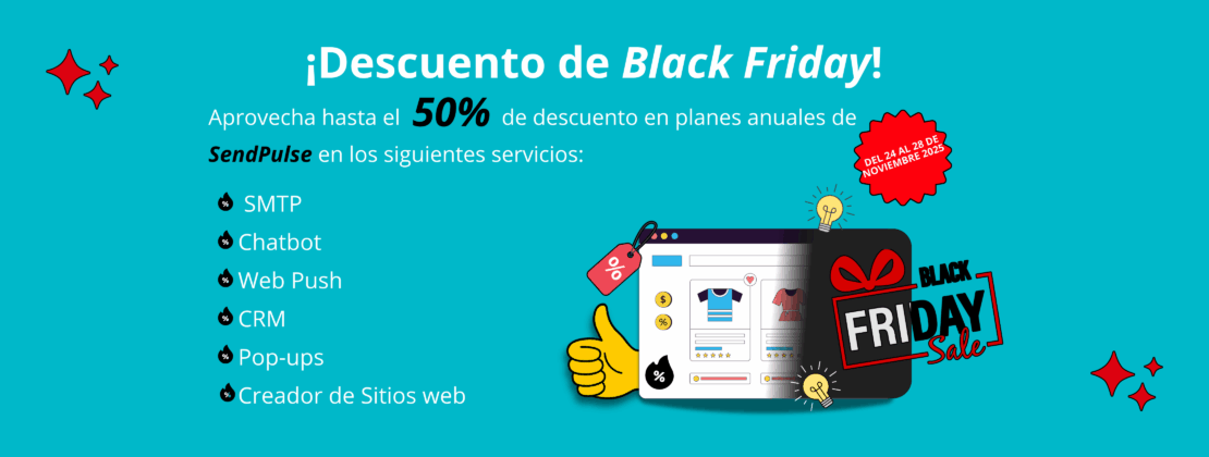 SendPulse, plataforma multicanal de marketing digital todo en uno, diseñó una landing page Black Friday para comunicar sus descuentos, fechas en las que se llevarán a cabo y todo lo que tu empresa puede ganar con esto. Además, añadió un reloj para la cuenta regresiva, lo que aumenta la sensación de urgencia y mantiene la expectativa.