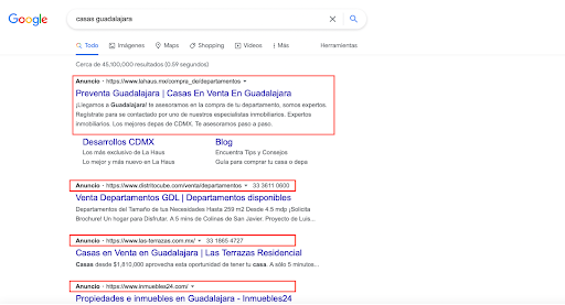 Los resultados en rojo son anuncios SEM relacionados con la palabra clave “casas guadalajara”.