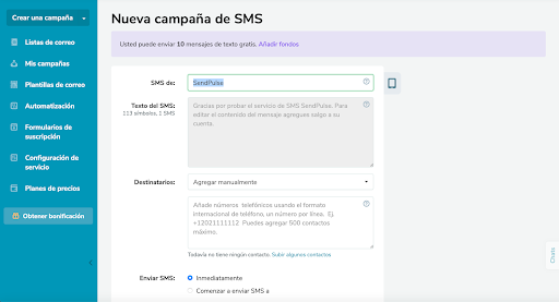 Campaña de SMS en SendPulse.