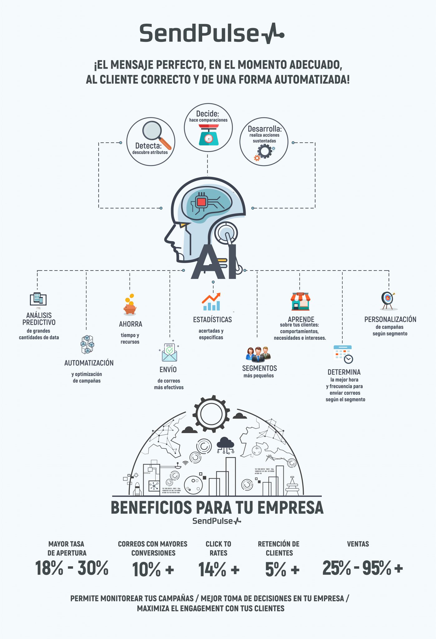 SendPulse es una de las pocas em presas de email marketing que utilizan la Inteligencia Artificial para brindarle a sus clientes mejores resultados en sus campañas de marketing. Un software de correo masivo con Inteligencia Artificial como el de SendPulse, recolecta información de la web y del comportamiento de los usuarios para realizar efectivamente diferentes acciones como: determinar el momento adecuado para enviar un correo masivo.