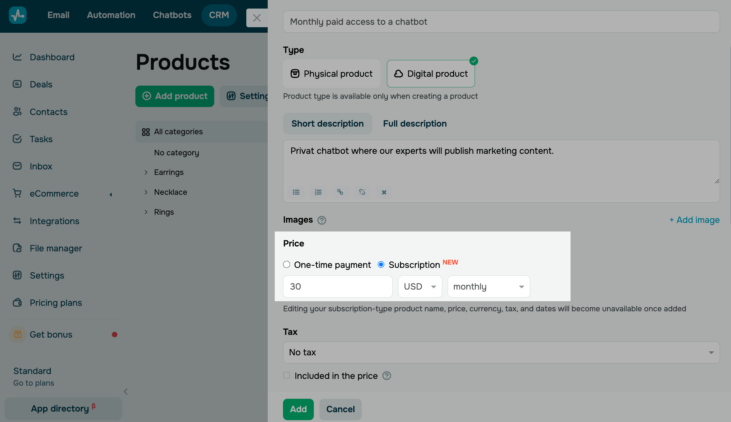 Ve a eCommerce > Productos y haz clic en Añadir producto. Selecciona el tipo de producto Digital. Añade un nombre y una descripción.