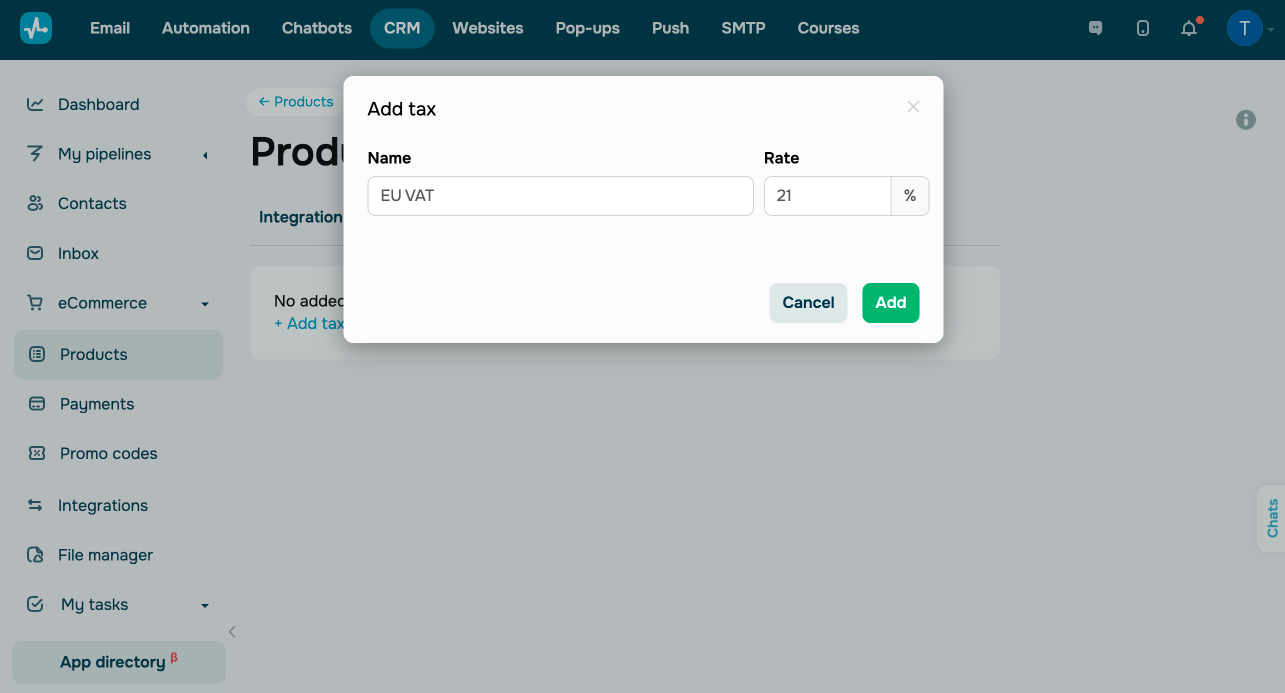 Ve a Productos > Configuración > Impuestos y haz clic en Añadir impuesto. Introduce un nombre y un importe para el impuesto.