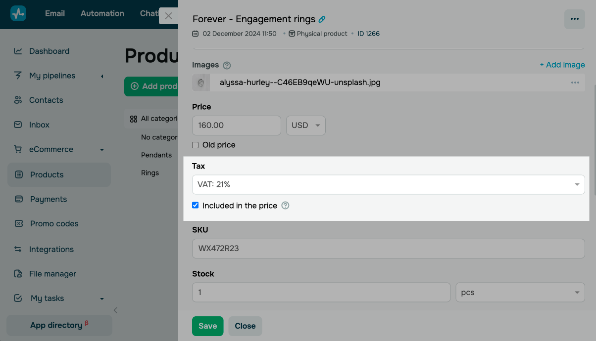 Selecciona la opción Incluido en el precio si es necesario. Cuando esta opción está activada, el impuesto se incluirá automáticamente en el precio del producto. De lo contrario, el importe del impuesto se añadirá al precio.