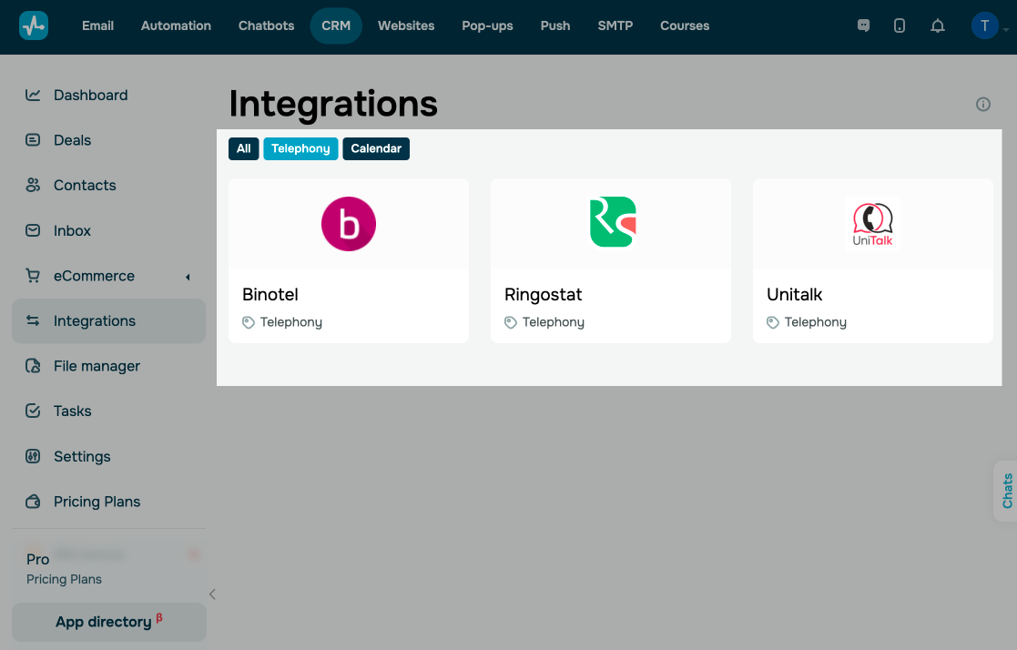 Vaya a Integraciones > Telefonía y elige un proveedor para conectarte. Puedes integrarte con Binotel, Ringostat o Unitalk. Encuentra más integraciones en el catálogo de aplicaciones.