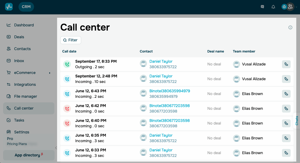 También puedes utilizar filtros para seleccionar llamadas por fecha, datos de contacto, tipo de llamada (entrante o saliente) y estado (respondida o perdida), así como por miembro del equipo asignado.