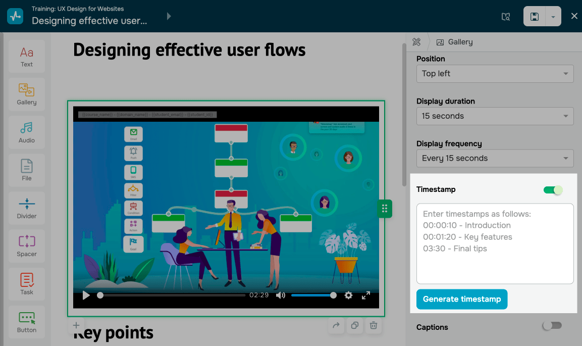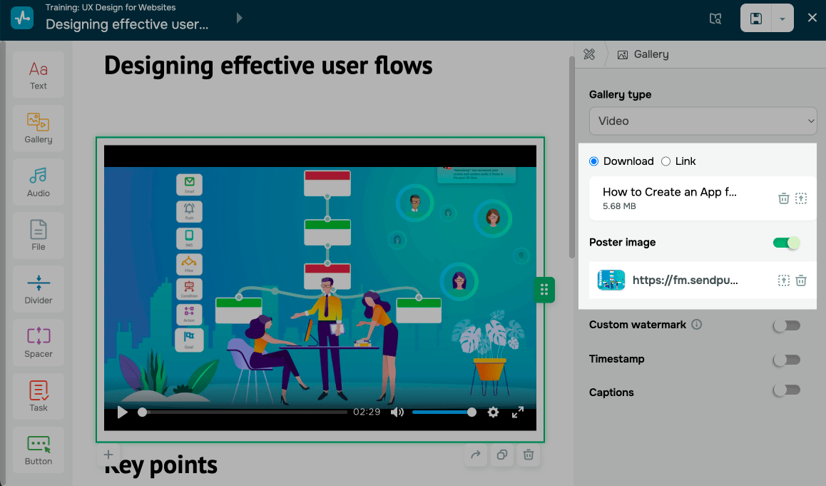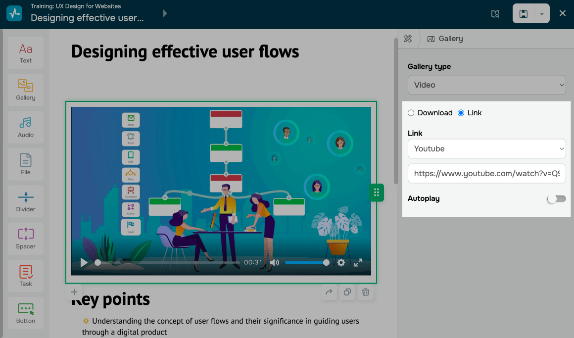 Utiliza el elemento Galería con el tipo Video para añadir videos a tus lecciones y facilitar el acceso de los estudiantes a ellos más adelante.