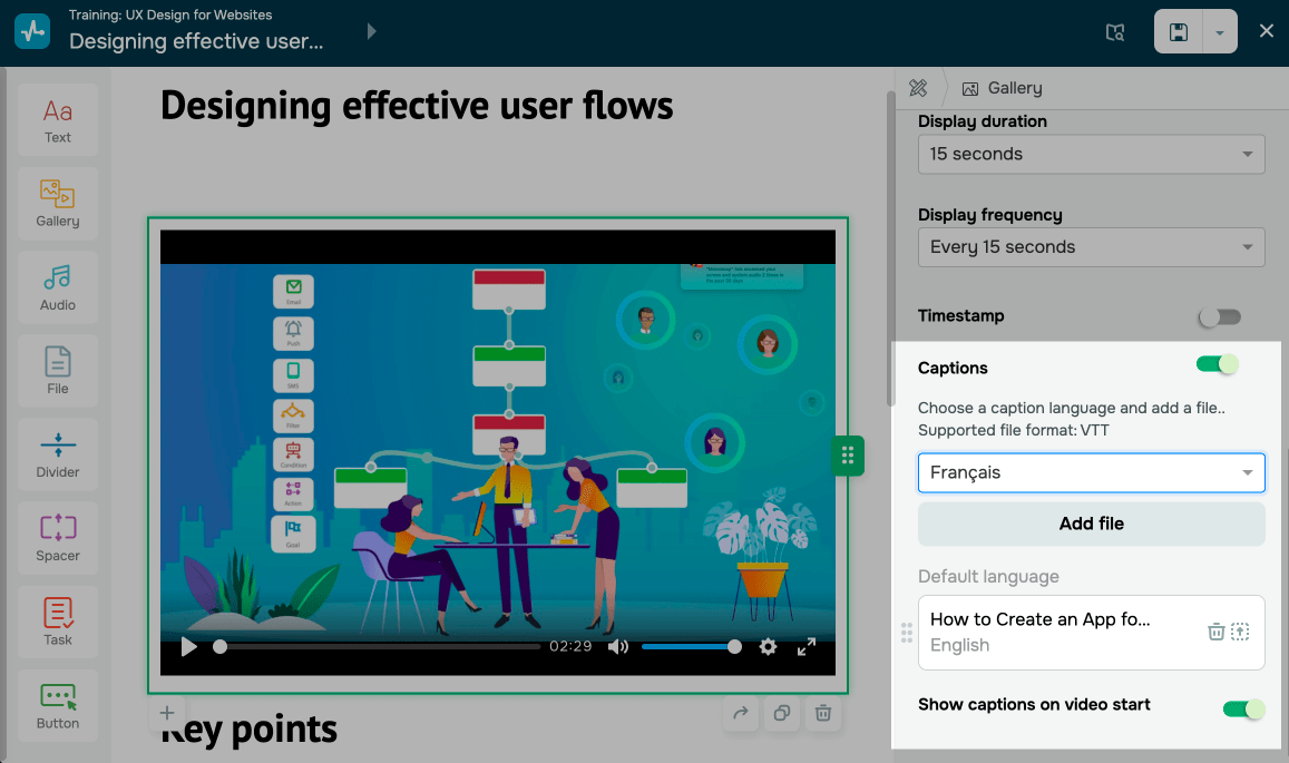 Utiliza subtítulos para ofrecer soporte en varios idiomas y ayudar a los estudiantes a comprender tus videos.