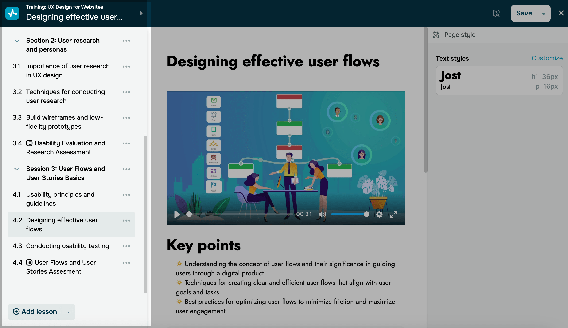 El área de trabajo en el centro te permite administrar el contenido del curso en cada sección, lección, examen o certificado.