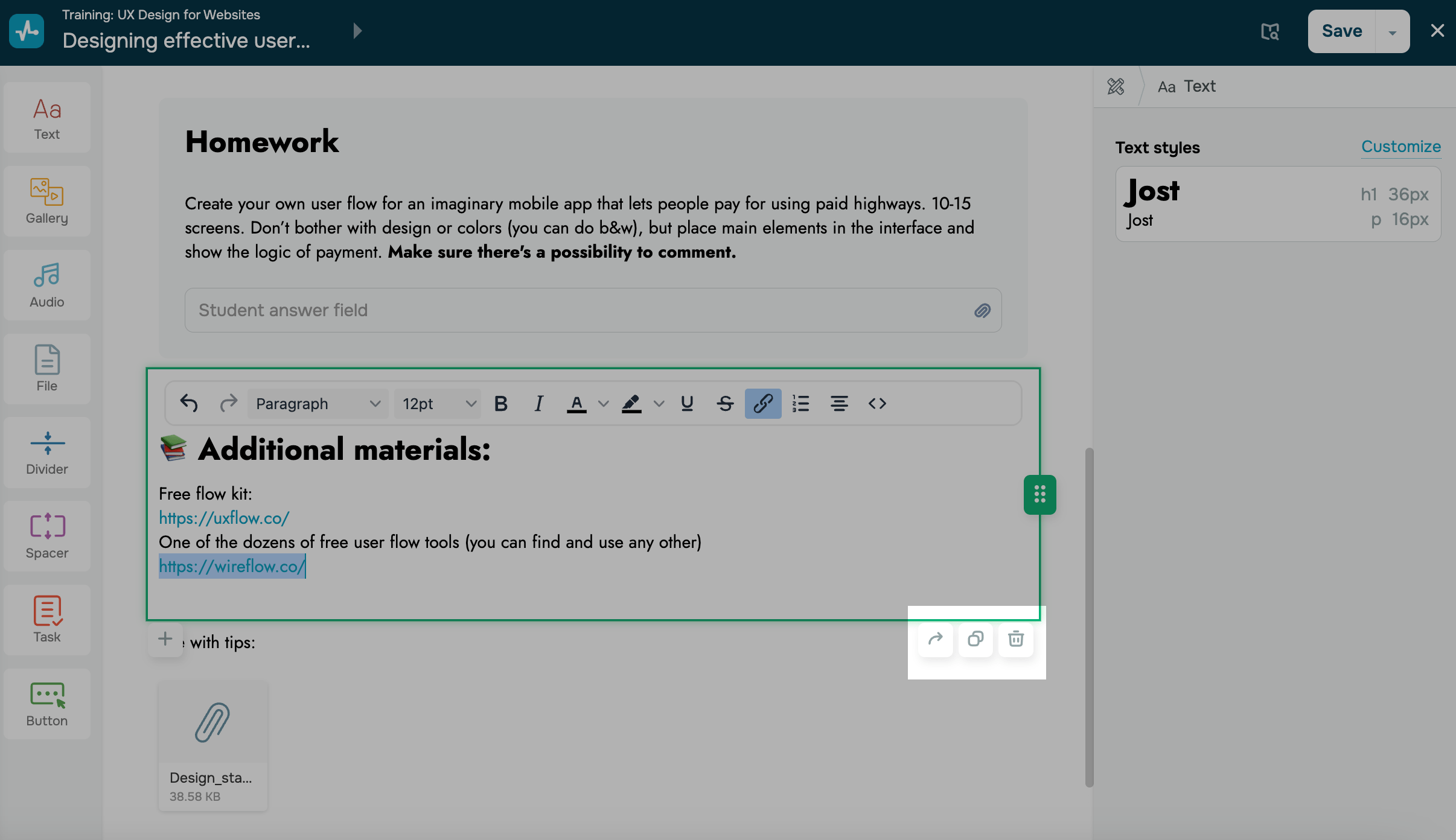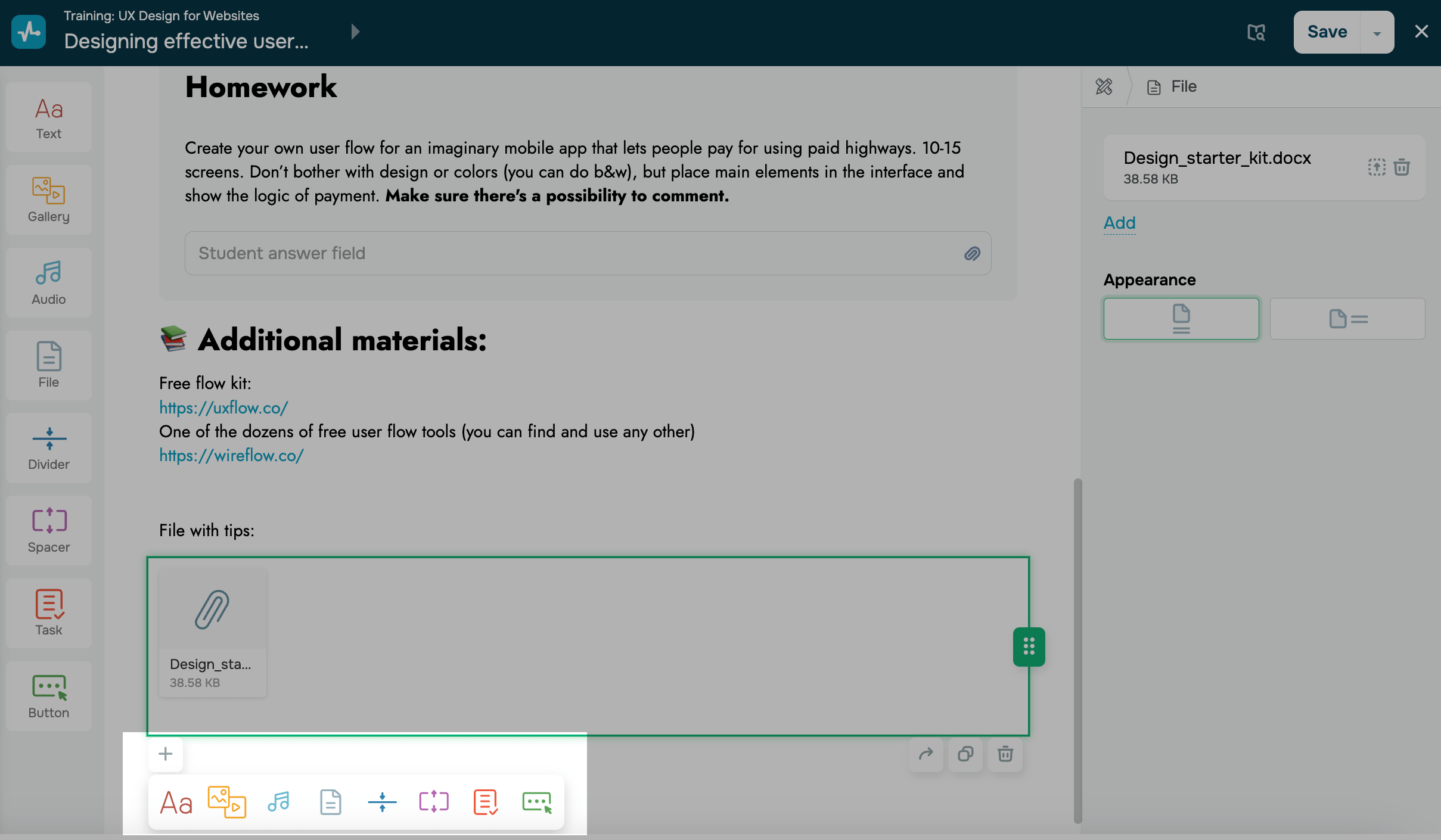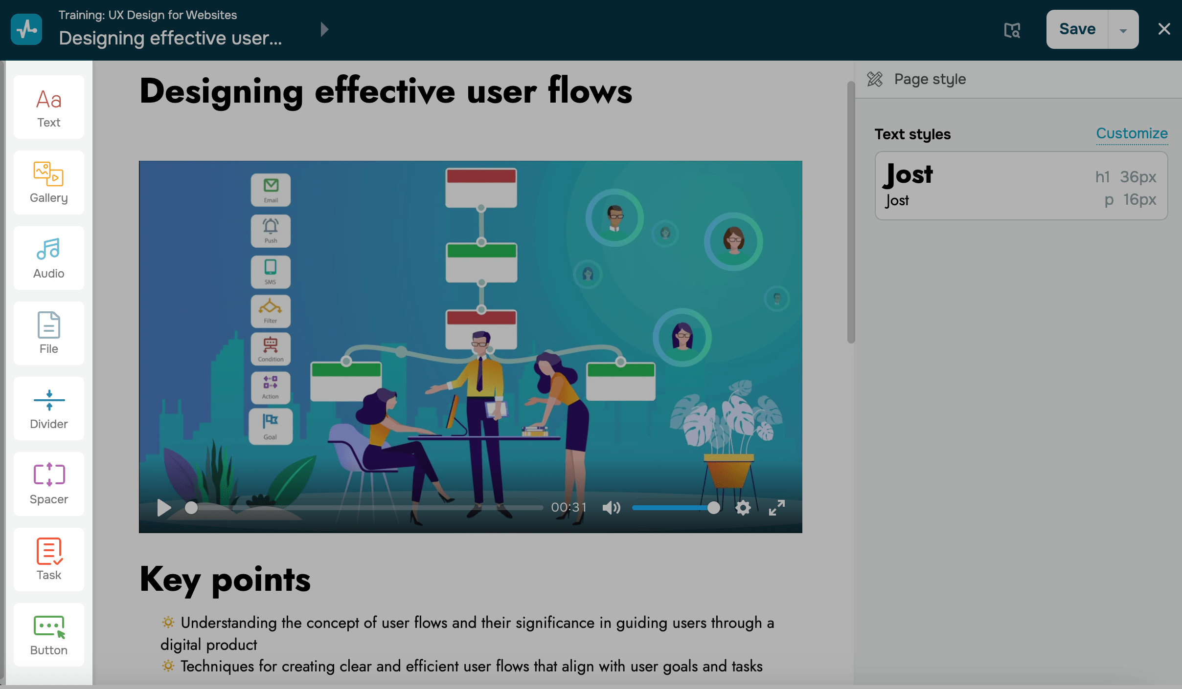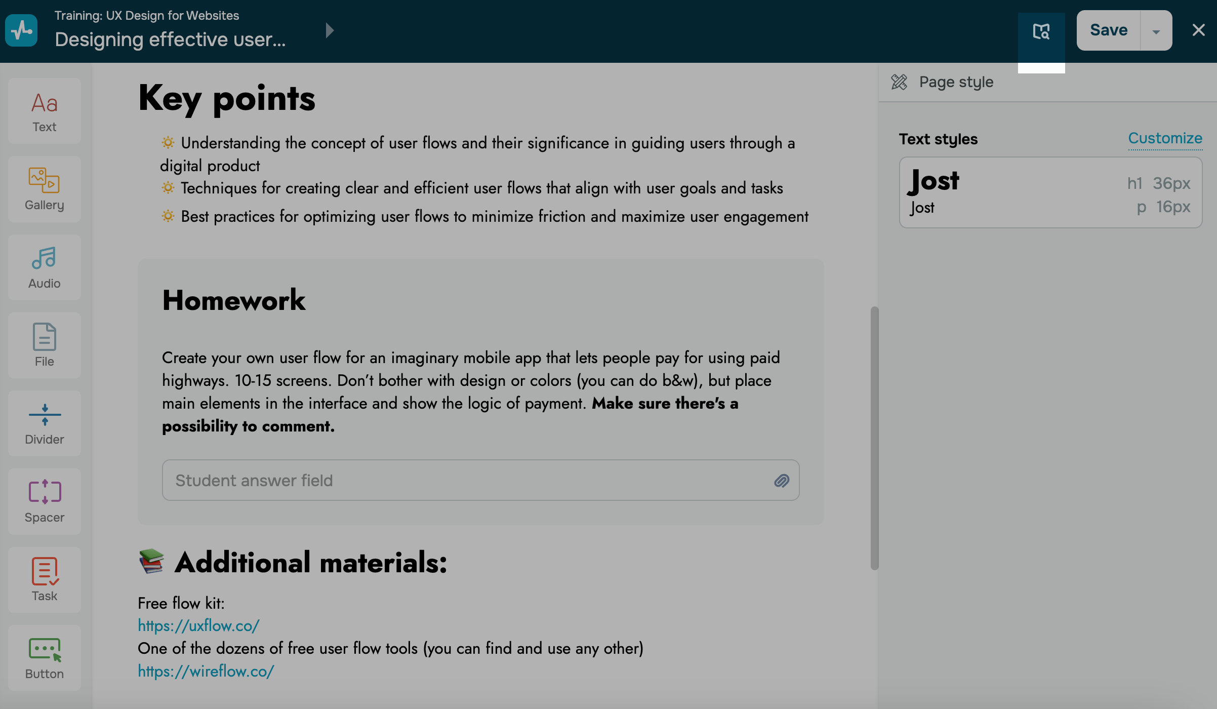 Puedes agregar varios elementos al contenido de tu curso, incluidos Texto, Galería (Video, Imagen o Carrusel), Audio, Separadores, Archivo o Tarea.
