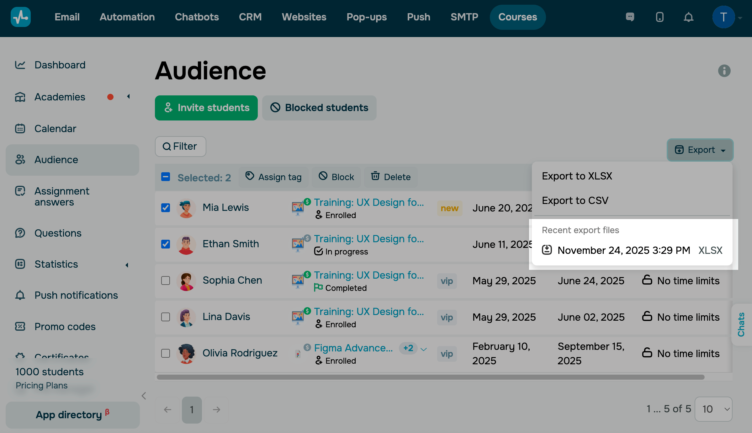 Puedes exportar tu lista de estudiantes para obtener datos claros y estructurados sobre tu audiencia para su análisis, la elaboración de informes o el uso de herramientas externas.