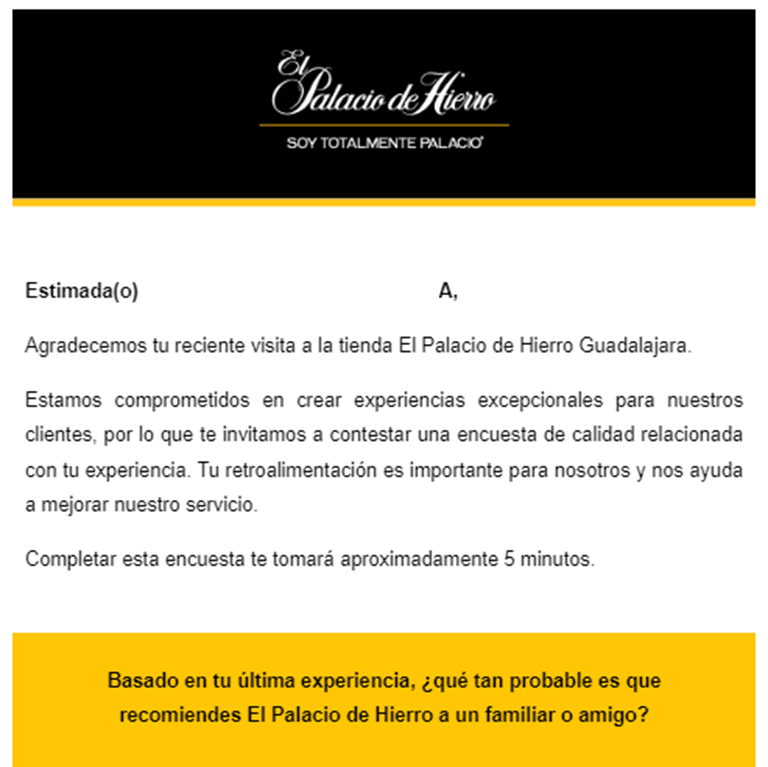 Con este correo electrónico, Palacio de Hierro da las gracias por la visita del cliente a una tienda física y lo invita a responder una encuesta para evaluar su satisfacción por la visita.