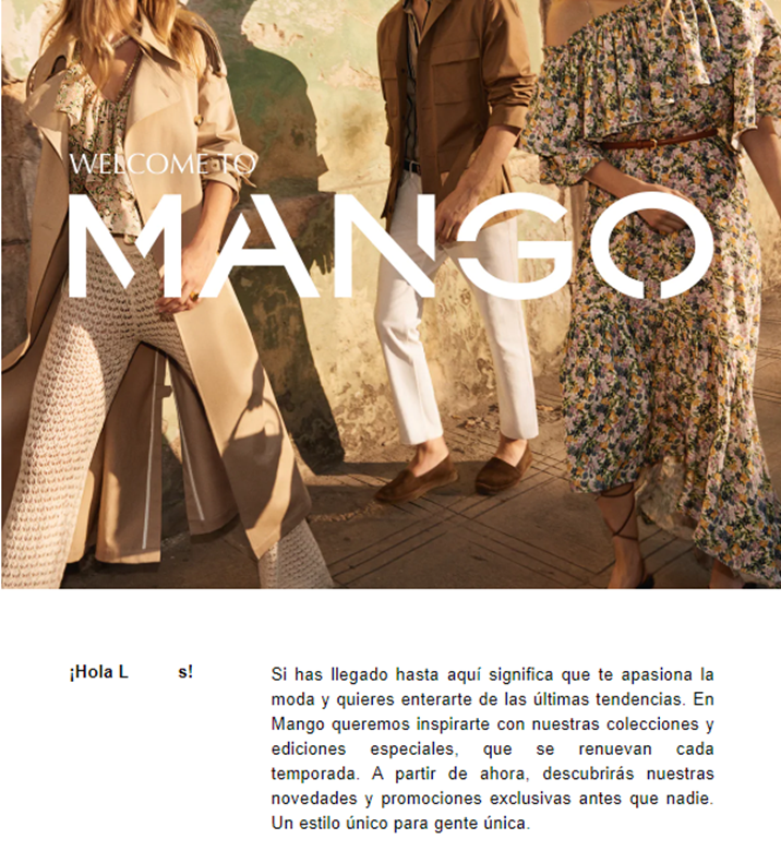 Un correo electrónico de bienvenida de Mango: