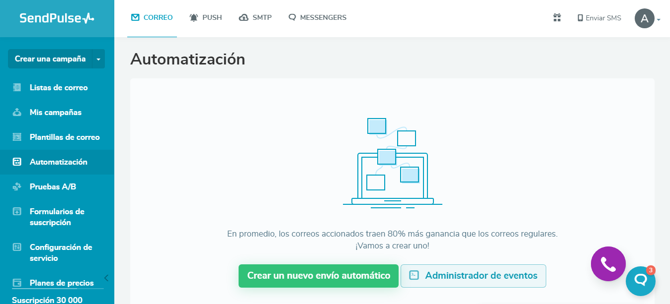 En tu cuenta SendPulse, ve a la pestaña "Automatización". Haz clic en "Crear un nuevo envío automático".
