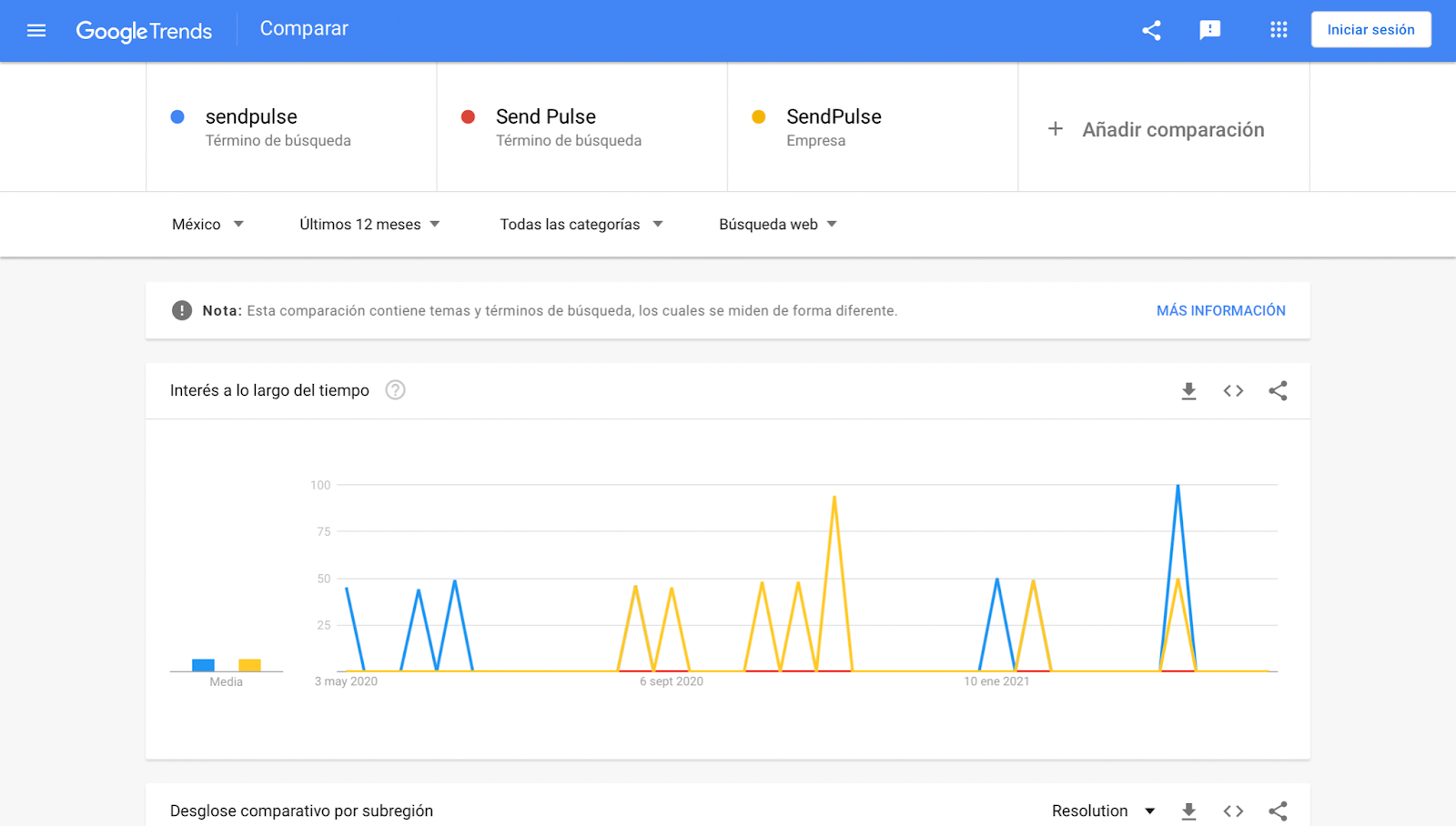Por ejemplo, en la siguiente imagen se puede observar la tendencia de búsqueda de la palabra “SendPulse” a nivel mundial.