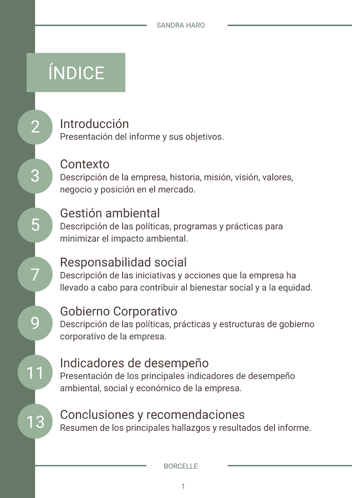 Si quieres que tus clientes naveguen libremente por tu propuesta de negocio, agrega un índice. Los enlaces en él llevarán a tus posibles clientes a la página que necesiten en ese momento.