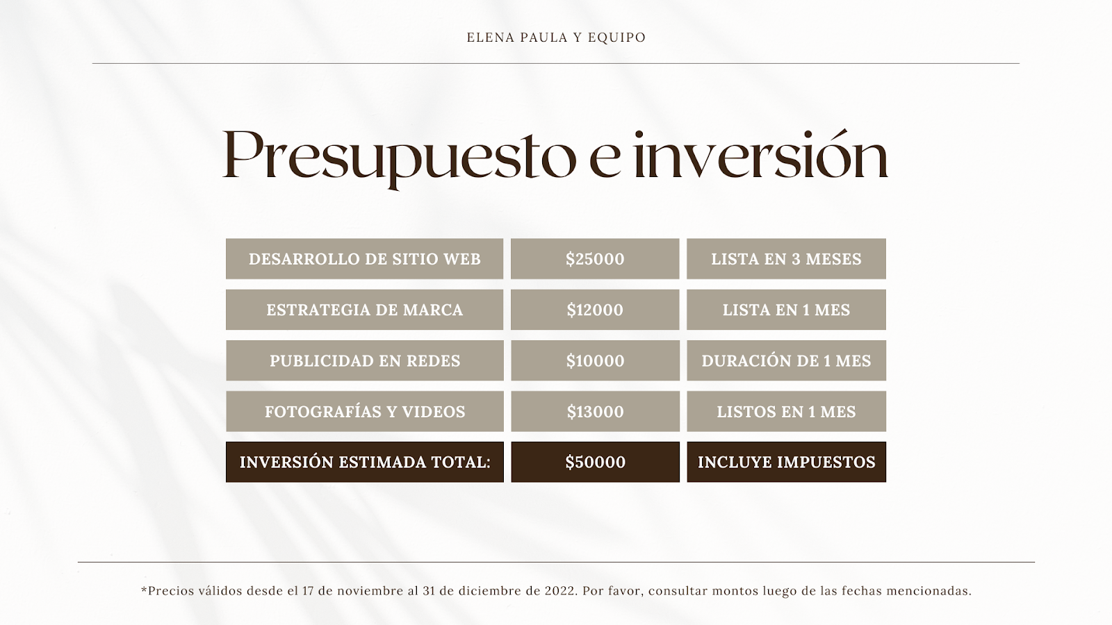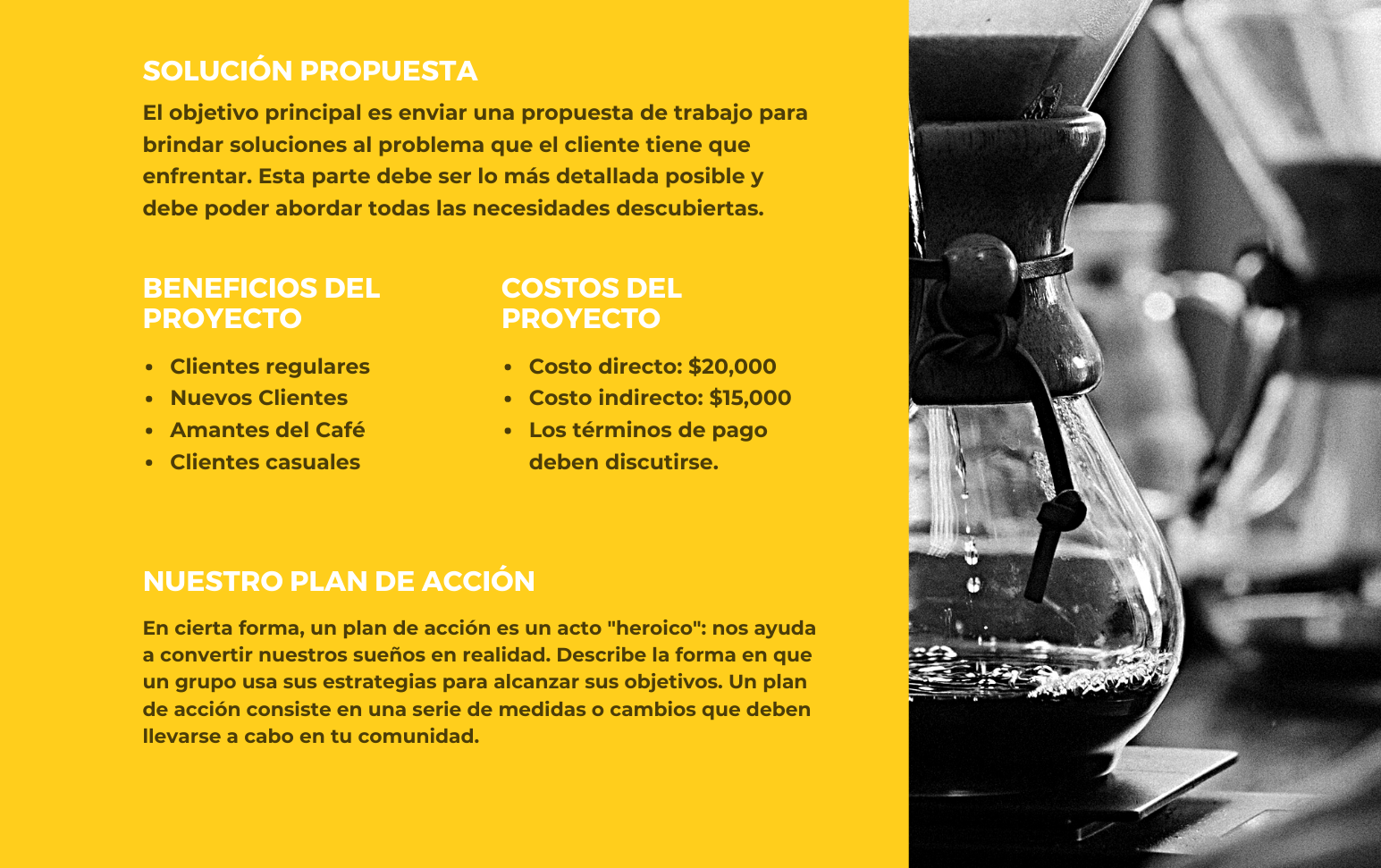 La apariencia y claridad de tu página de título son esenciales para dar la impresión correcta y establecer confianza. Debe incluir la información más importante sobre tu negocio, como el nombre del creador, el nombre de la marca y la fecha de la propuesta. También debes agregar el nombre del cliente. Asegúrate de que tu página de título sea visualmente atractiva e informativa.