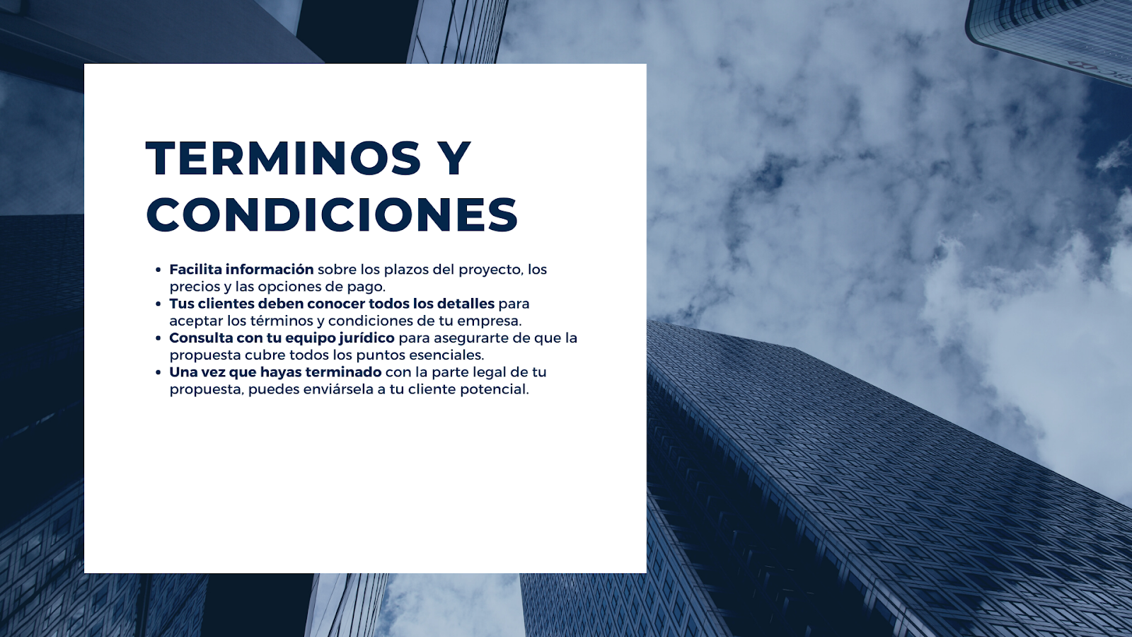 La última página debe incluir un recuadro para la firma. El cliente firmará el documento si está de acuerdo con tu oferta, términos y condiciones. Explícale lo que acepta al firmar tu propuesta.