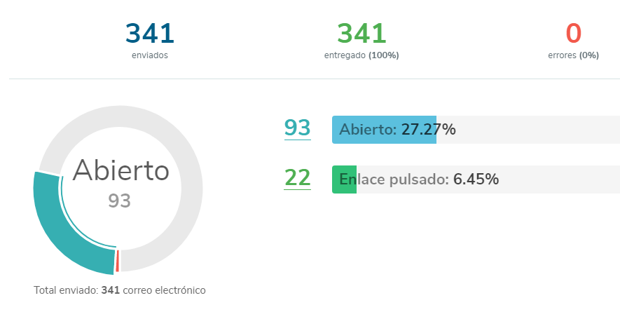 Puedes realizar un seguimiento de tu participación en el correo electrónico al monitorear la tasa de apertura, el CTR y la tasa de baja. Estos datos son cruciales para comprender qué tipo de contenido funciona mejor con tu audiencia. Si envías tus campañas de correo electrónico con SendPulse, la pestaña de estadísticas se verá así en tu cuenta: