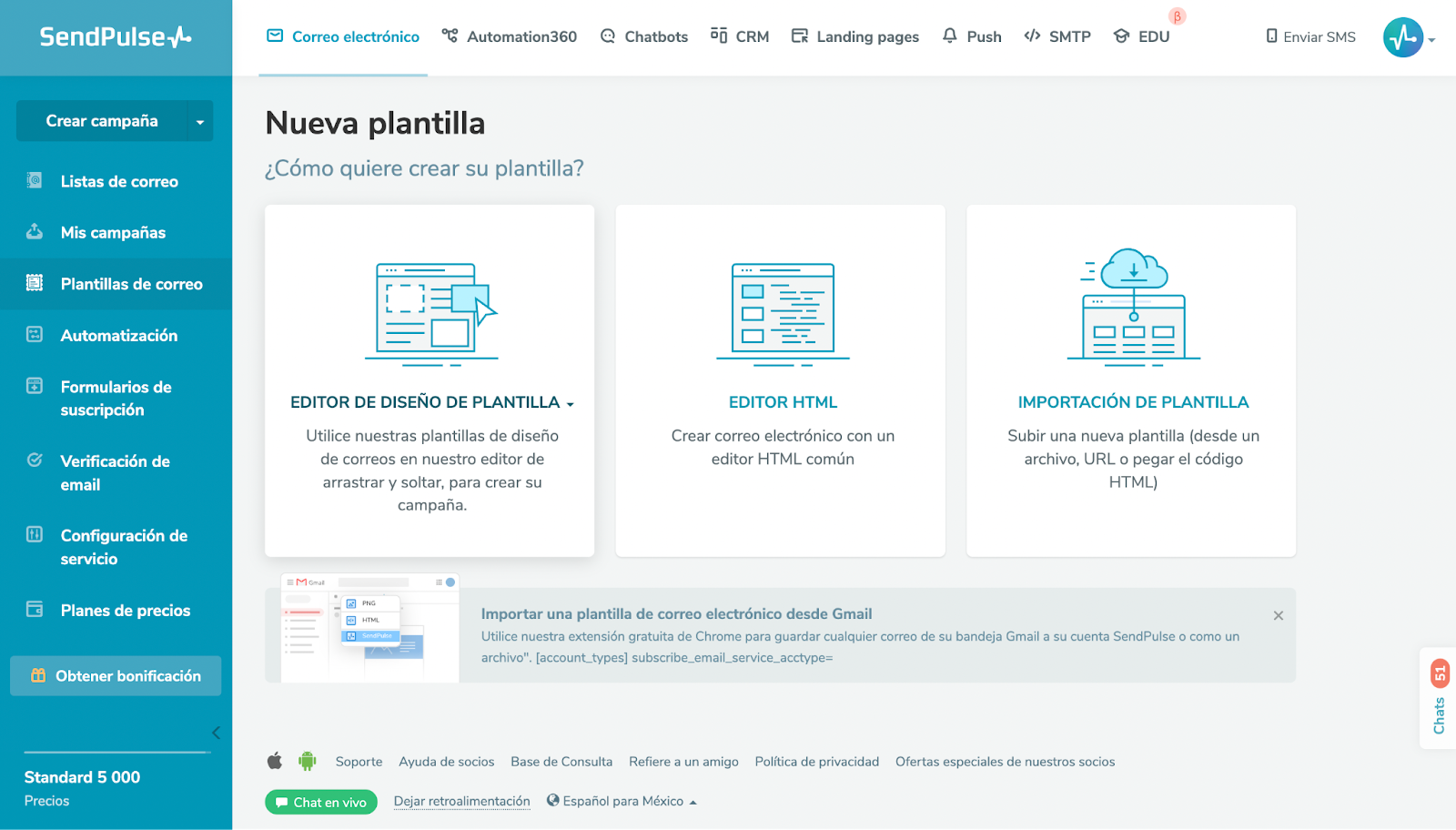 En la sección Correo electrónico de tu plataforma SendPulse, haz clic en la opción Plantillas de correo, que se encuentra en el menú lateral izquierdo. Después, haz clic en Agregar plantillas.