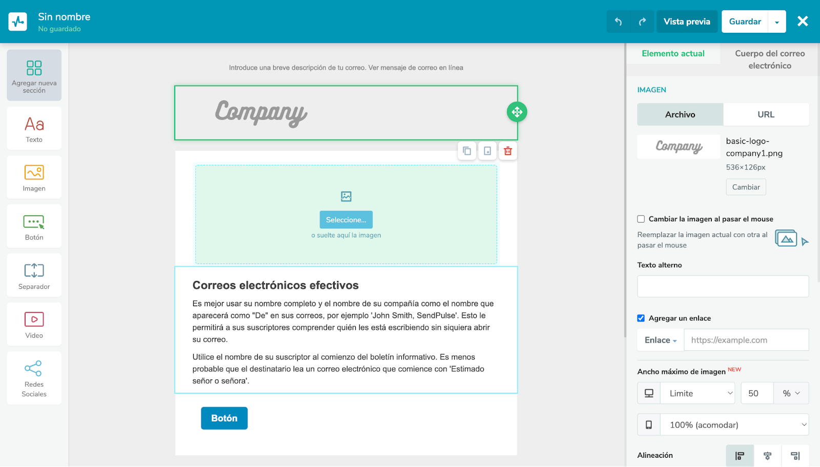 Inmediatamente se abrirá el editor de la plantilla. En este punto puedes agregar imágenes, textos y botones. Es importante que contemples todos los elementos que te señalamos en la sección anterior.
