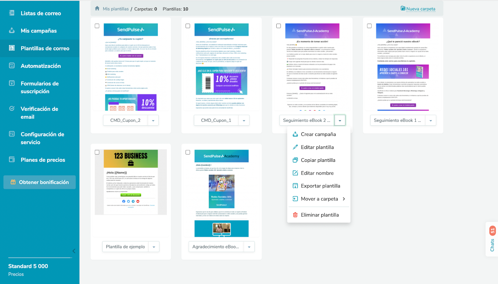 Selecciona la plantilla que acabas de crear y haz clic en el icono de triángulo para desplegar el menú. Ahí, selecciona la opción Crear campaña y automáticamente se abrirá el creador de campañas.