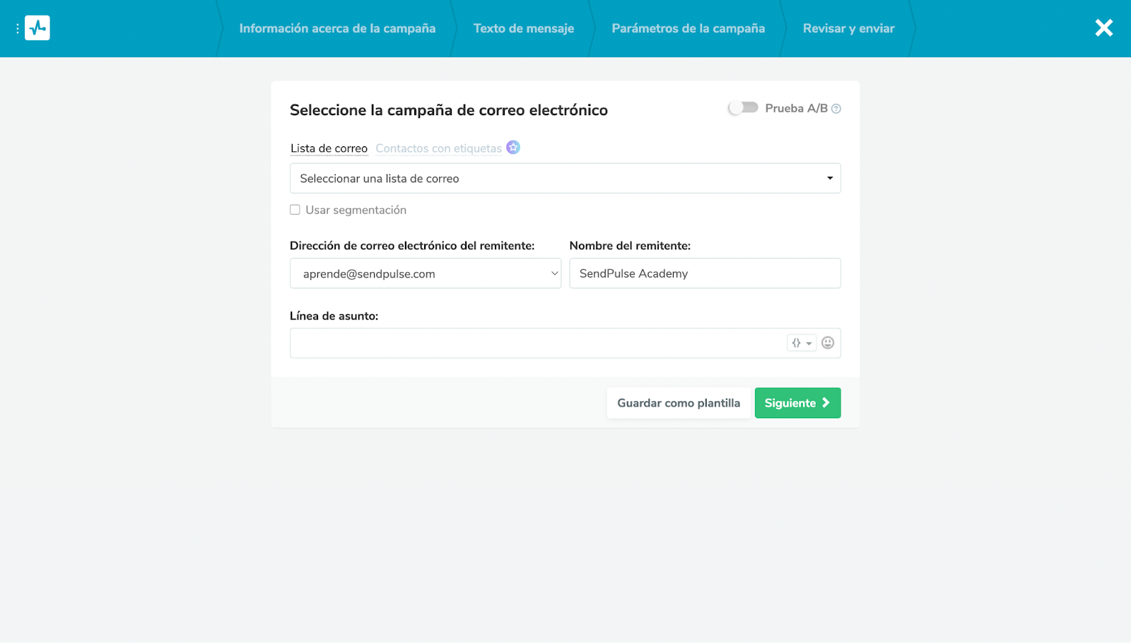 A continuación selecciona una lista de correo para enviar la campaña, así como la dirección de correo electrónico y nombre del remitente. En esta parte tendrás que colocar la línea de asunto, la cual debe ser llamativa y que genere curiosidad. Cuando termines haz clic en Siguiente.
