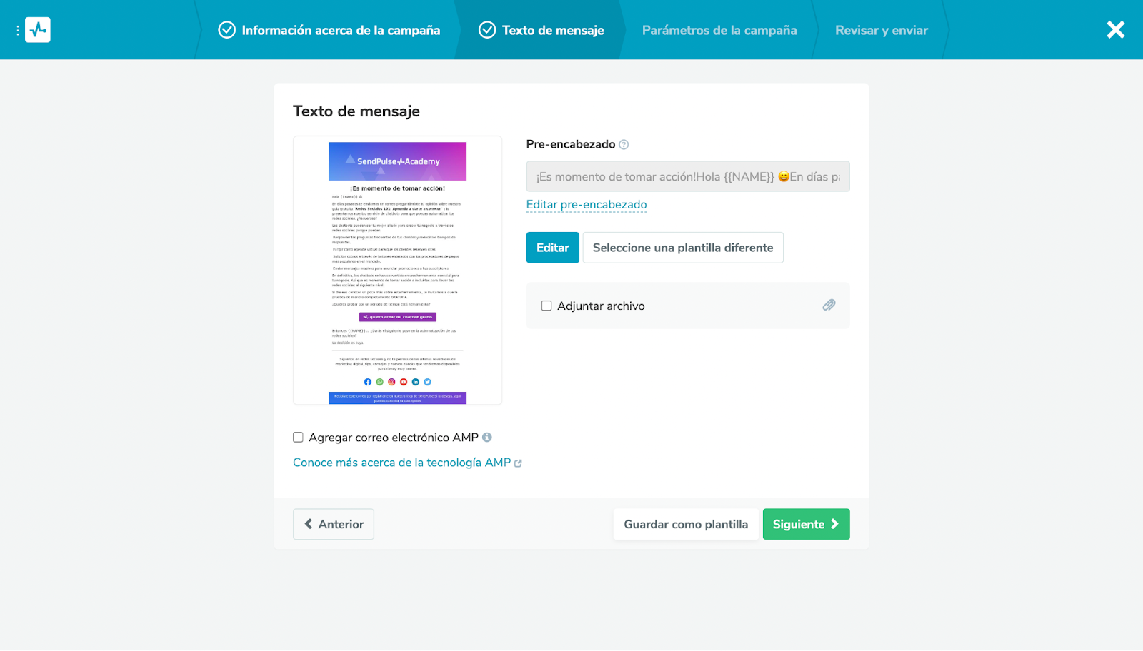 Puedes cambiar el pre encabezado o adjuntar archivos si lo deseas. Al terminar haz clic en Siguiente para abrir los parámetros de la campaña.