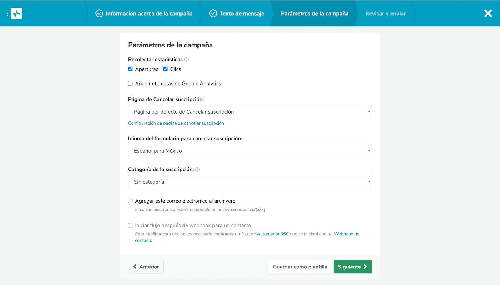 Selecciona las métricas que se medirán en la campaña y las características de la página para cancelar la suscripción. Después haz clic en Siguiente para programar la campaña o enviarla en ese momento.