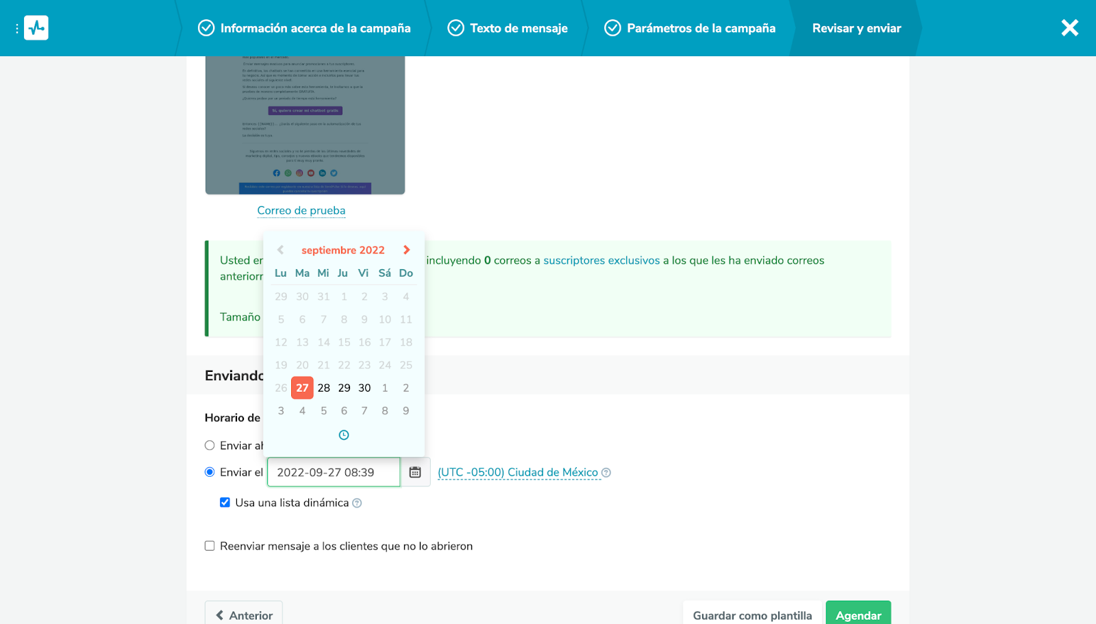 Ahí selecciona la opción “Enviar el …” y haz clic en el cuadro con la fecha para seleccionar el día y la hora en la que deseas enviar la campaña. Una vez que establezcas estos datos, haz clic en el botón Agendar y la campaña de invitación a evento quedará programada.
