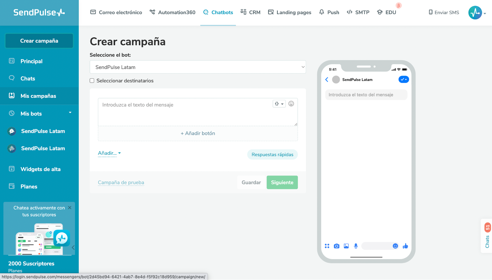 Para crear un bot y utilizar esta plataforma como medio masivo, te recomendamos SendPulse, ya que cuenta con una API oficial que te garantiza el buen funcionamiento del chatbot, así como herramientas de personalización y la posibilidad de generar flujos automatizados para crear estrategias completas con otros medios masivos digitales.