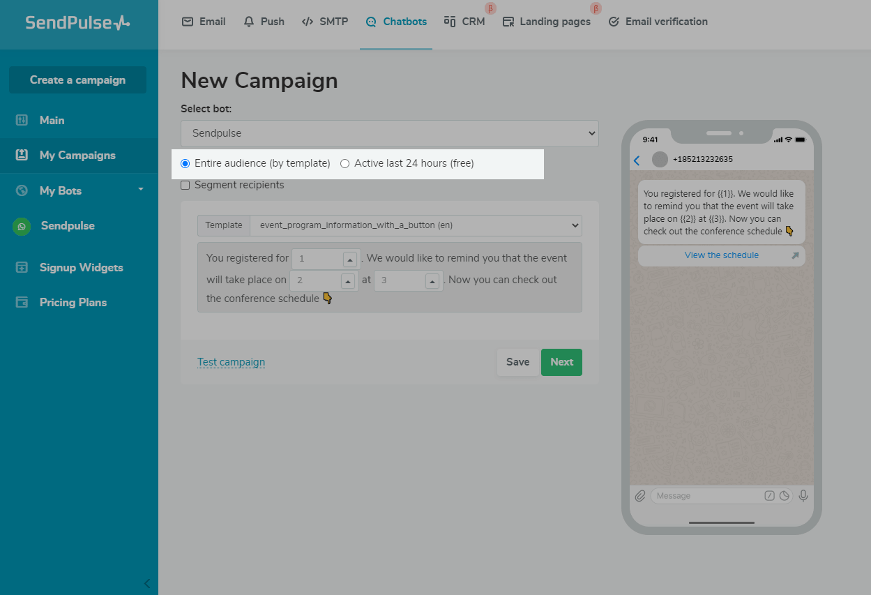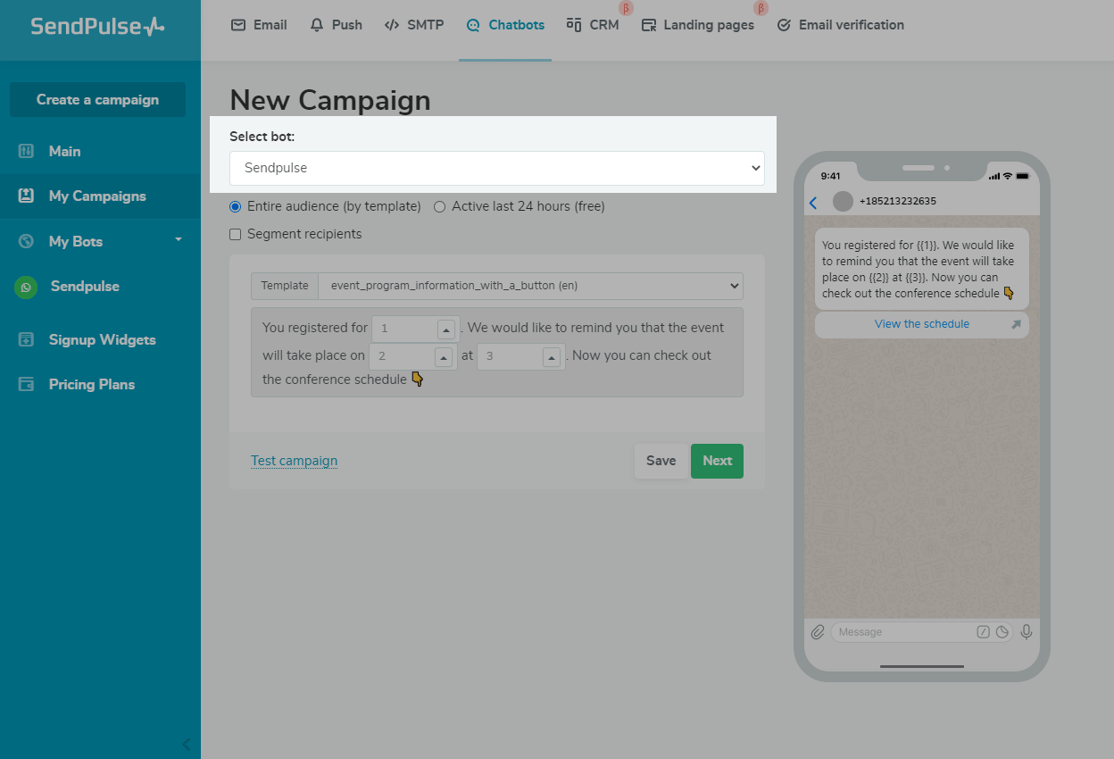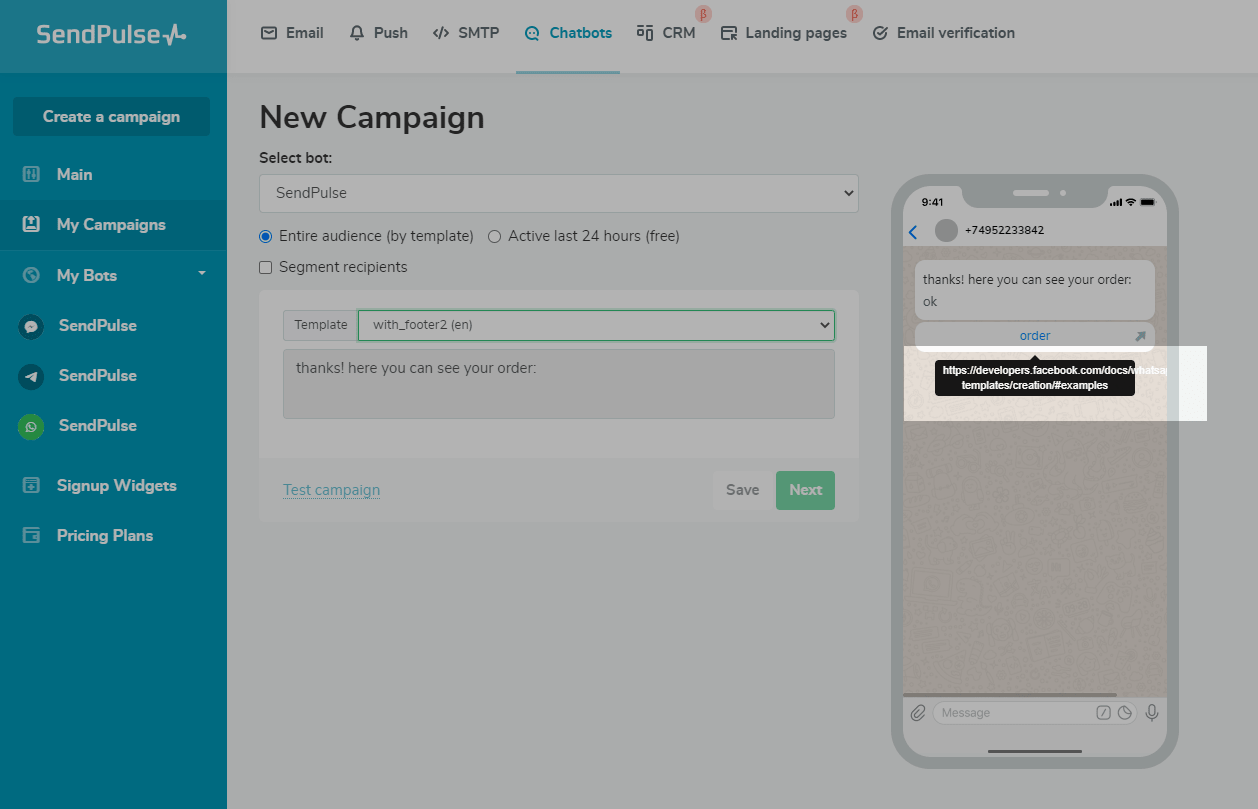 La publicidad móvil en SendPulse puede utilizarse de múltiples maneras. Por ejemplo, creando campañas automatizadas para WhatsApp. Para ello, se tiene que tener conectado un bot con tu cuenta de WhatsApp, si aún no lo tienes, puedes checar este video: