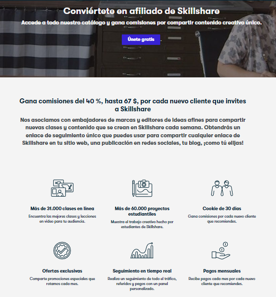 Skillshare ofrece a sus clientes un programa de afiliados. La empresa paga a los afiliados $7 USD por cada cliente traído a la marca.