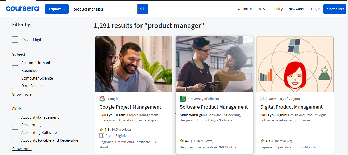 No existen programas educativos estatales sobre gestión de productos. Además, la universidad no siempre es una buena opción. Sin embargo, puedes elegir entre una amplia gama de cursos para adquirir conocimientos básicos en la materia. Hay muchos en Coursera, por ejemplo.