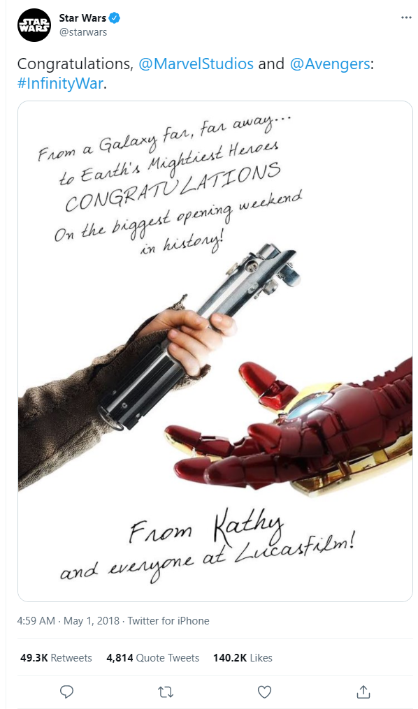 Por ejemplo, Star Wars logró recibir más reconocimiento y mejoró su reputación entre los cinéfilos y amantes de los cómics, cuando felicitó a Marvel por el estreno de Avengers: Infinity War.