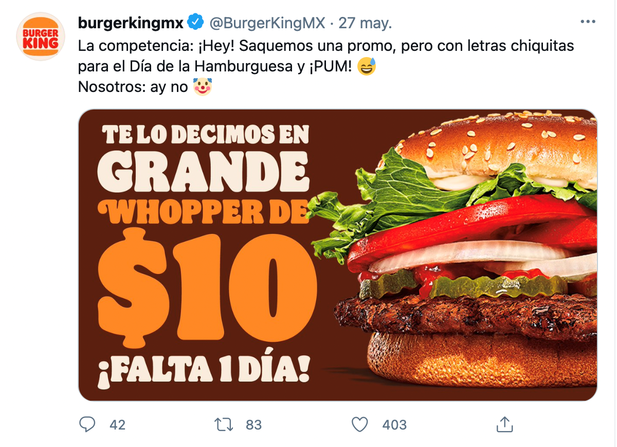 Un ejemplo de Marketing en tiempo real o Real-Time Marketing es la que hizo Burger King en su campaña del 2021 durante el Día de la Hamburguesa en México. En ese entonces, Carl’s Jr (competencia directa) lanzó una promoción con varias restricciones o “letras chiquitas”. Ante esta situación que estaba en tendencia, Burger King decidió enfocar su publicidad en esta situación.