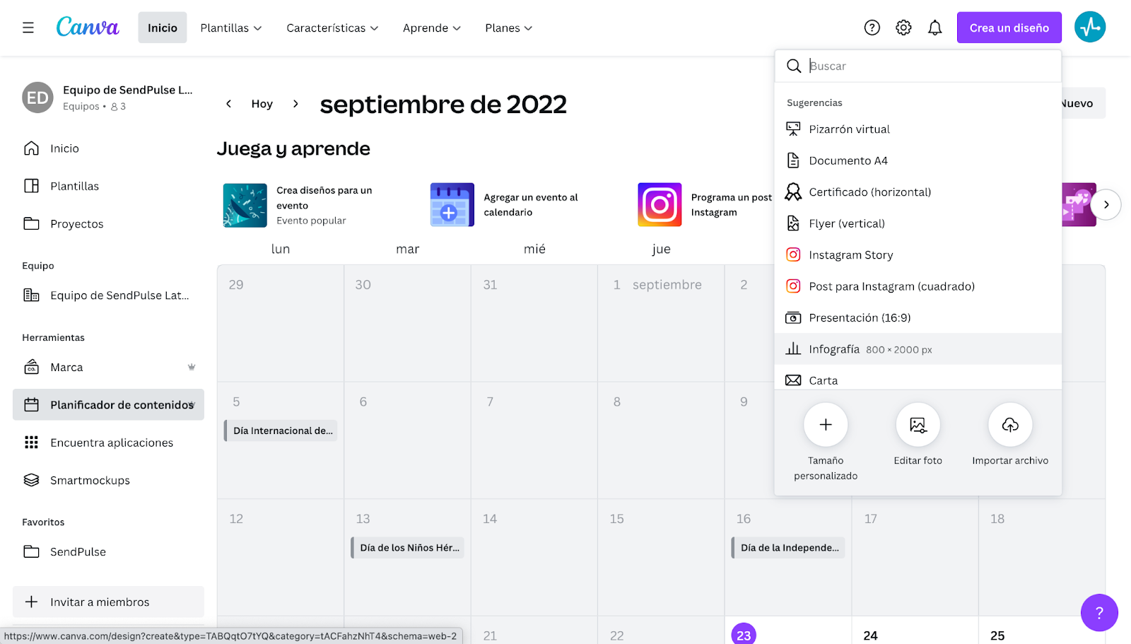 Canva es una plataforma de edición de imágenes que permite calendarizar y programar publicaciones en redes sociales. De igual manera, cuenta con plantillas para crear contenido en las distintas redes sociales, con el objetivo de que cada pieza que se diseñe desde su plataforma sea adaptada al interfaz de cada red social.