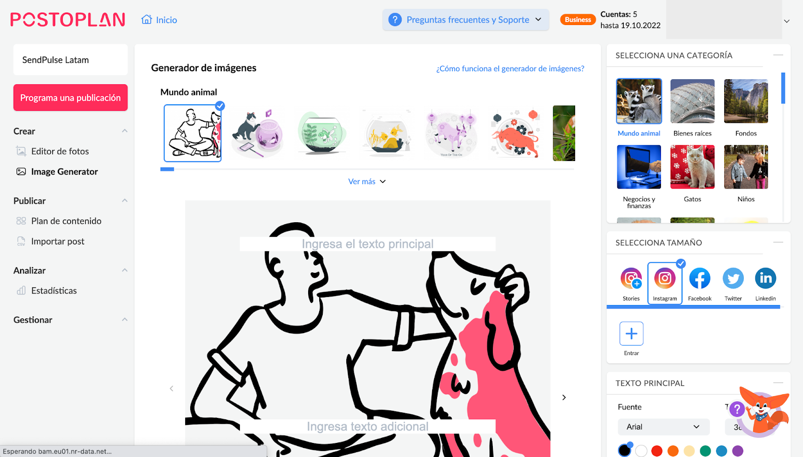 PostoPlan es una plataforma especializada en la gestión de contenidos en redes sociales. Cuenta con un editor de imágenes que te permitirá crear contenido para cada una de tus redes sociales. De igual manera, cuenta con un planificador de contenidos que te permitirá realizar copys personalizados para cada red social, así como identificar el mejor horario para publicar.