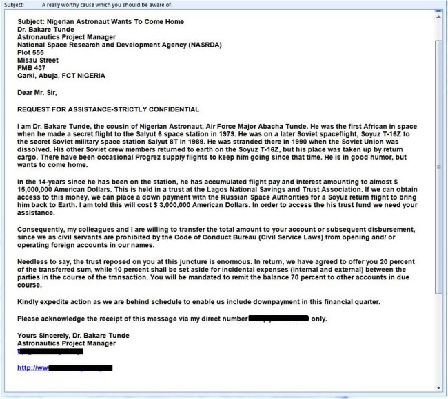 Este fraude es conocido en todo el mundo. También se llama estafa del banco nigeriano, oferta de dinero nigeriana, carta nigeriana, fraude 419 fraude, estafa nigeriana. Es evidente el país de origen. Fue un fraude postal enviado durante las décadas de 1970 y 1980, durante la Segunda República Nigeriana. Se creía que muchas de las cartas fueron escritas por miembros de la familia real, el gobierno y empresarios. Pidiendo ayuda financiera, en particular, números de cuentas bancarias. Pretendían necesitar ayuda debido a la devaluación de la moneda en el país. Entonces, se convirtió en un fraude popular por correo electrónico. Los spammers afirman que han heredado una fortuna pero necesitan de su cuenta bancaria para transferir el dinero, si los ayuda, podrá conservar los intereses. Así, la gente envía una suma por adelantado y reciben nada a cambio.