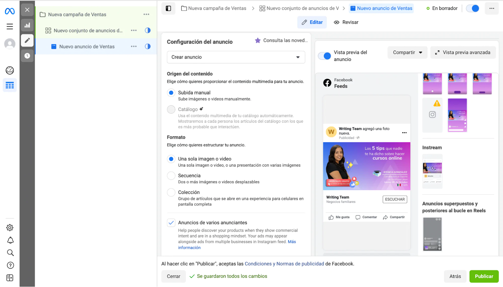 - Crea un anuncio. Facebook te permite utilizar un video, una imagen sola, un carrusel o una galería.