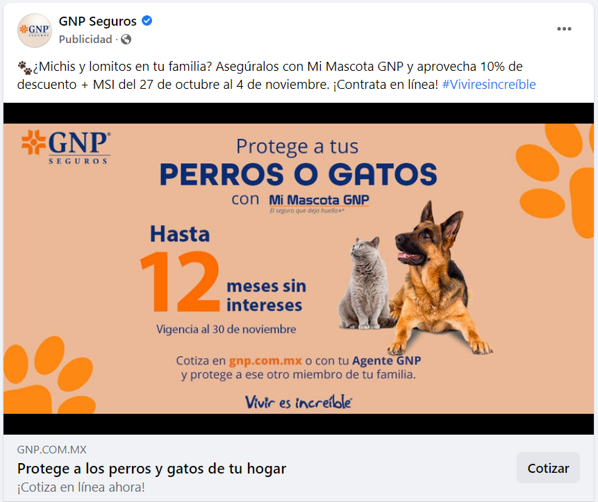 Así, GNP Seguros tiene este anuncio pagado donde se dirige especialmente a quienes tienen un historial de búsqueda alrededor de productos y servicios para mascotas. De esta manera, GNP se asegura que quienes verán su publicidad están ya interesados y, además con la información adecuada, sencilla y al grano, podrán convencer más fácilmente a sus prospectos.