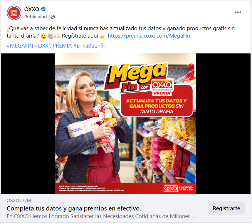 Oxxo utiliza su publicidad dirigida no solamente para mostrar sus ofertas, un objetivo muy común sobre todo acercándose las fechas de fiestas, sino que muestra, por encima de todo, sus programas de lealtad y puntos con los que busca posicionarse por encima de otras tiendas de conveniencia.